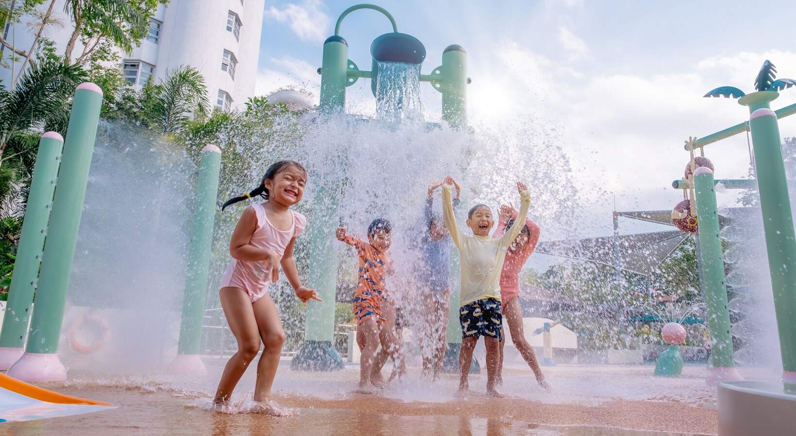 Come to our water playgrounds and escape the summer heat! Our colourful outdoor waterplay parks take families on a whole new wave of adventure and play! From meandering around lazy rivers to sliding down vertical drops on the slides, from splashing with water sprouts and jet cannons to stepping on the shallow wading pools, your little swimmers can fulfil every adventure they aspire with us. Parents can look forward to lounging on the poolside decks completely worry-free, while watching your little energetic kiddos cool down from the heat.